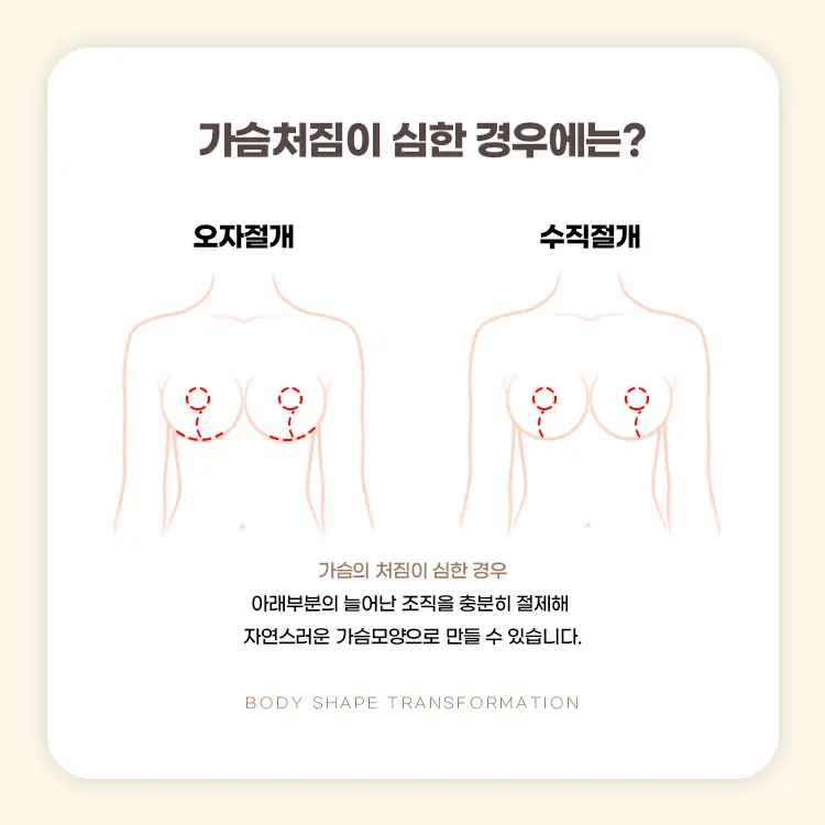 보형물 수술은 가슴 크기를 키우지만 처짐 자체를 해결하는 데 한계가 있어요.