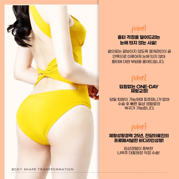 체형 조각과 동시에 엉덩이에 볼륨을 추가할 수 있고, 인공 보형물이 아닌 자신의 지방을 사용하여 부작용이 적어요.