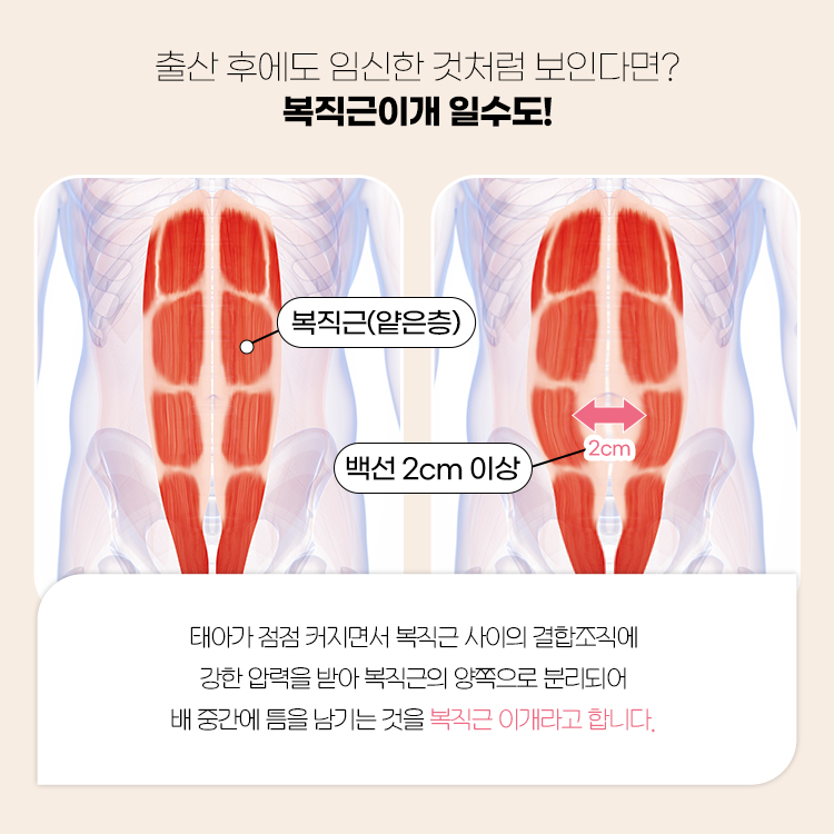 임신과정에서 태아가 점점 커지면서 복직근 사이의 결합조직에 강한 압력을 받아 복직근의