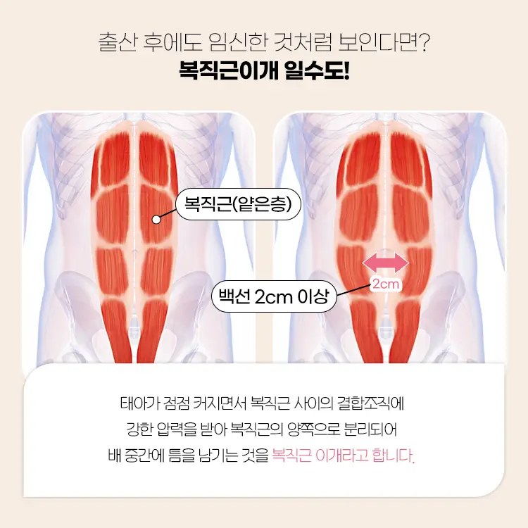 보통 임신 중 태아가 자라면서 자궁이 확장되고, 이에 따라 복직근이 좌우로 벌어지게 돼요.