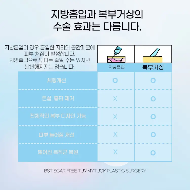 | 목적 | 지방 제거 | 처진 피부 제거 + 복부 근육 교정 |