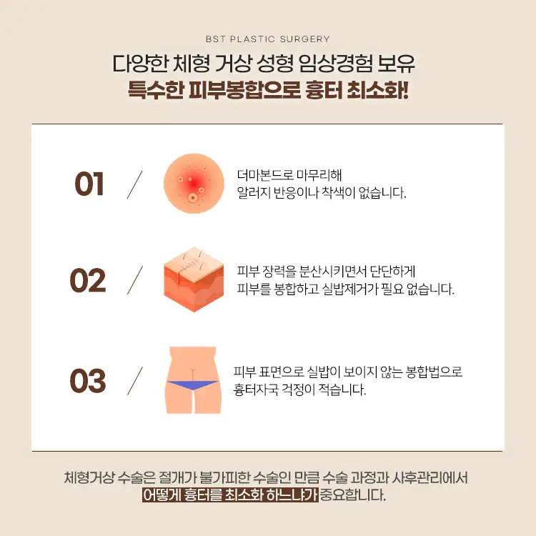 - 비에스티성형외과 대부분의 환자분들은 "흉터보다 라인 개선이 훨씬 만족스럽다"라고 말씀하시곤 합니다.