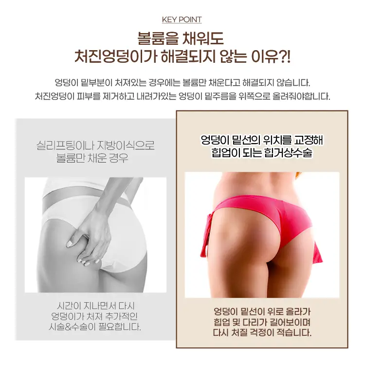 이 상태에서 엉덩이에 볼륨만 추가하는 것은 엉덩이 밑선의 위치 변화도 없고 시간이 지나면 엉덩이 볼륨 무게로 인해 처짐이 더 심해질 수 있어요.