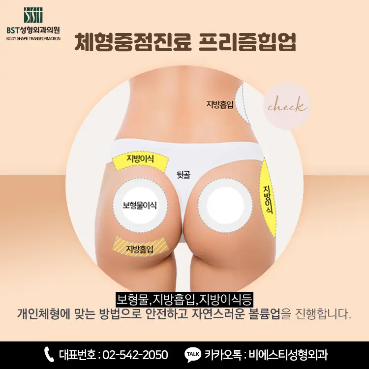 | 엉덩이보형물 | 실리콘 보형물을 엉덩이 근육 아래 또는 위에 삽입 | 또렷한 라인, 유지력 강함 |