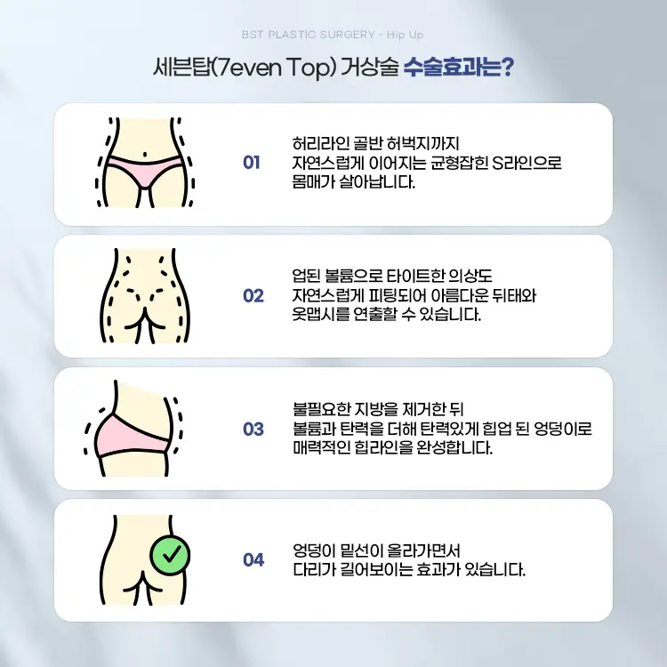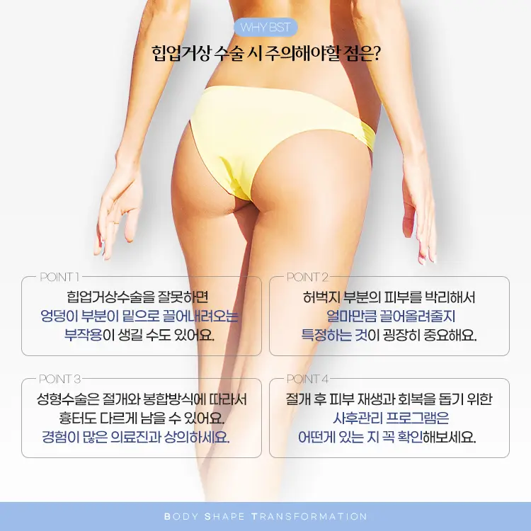 따라서 엉덩이의 피부 처짐이 심하고 운동이나 생활습관을 리프팅될 상태가 아니라면 힙거상술이 필요할 수 있어요.