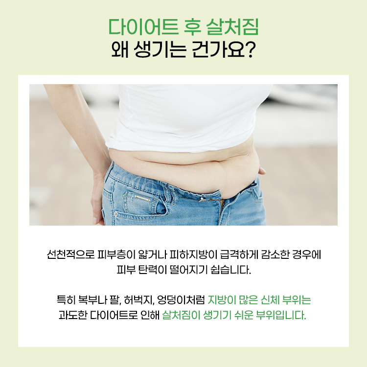특히 복부나 팔, 허벅지, 엉덩이처럼 지방이 많은 신체 부위는 과도한 다이어트로 인해 살처짐이 생기기 쉬운 부위입니다.