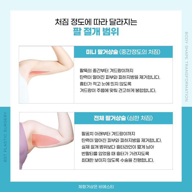 팔 거상술의 경우에는 처짐의 정도에 따라 절개범위가 달라지며 그 수술방법도 다릅니다.