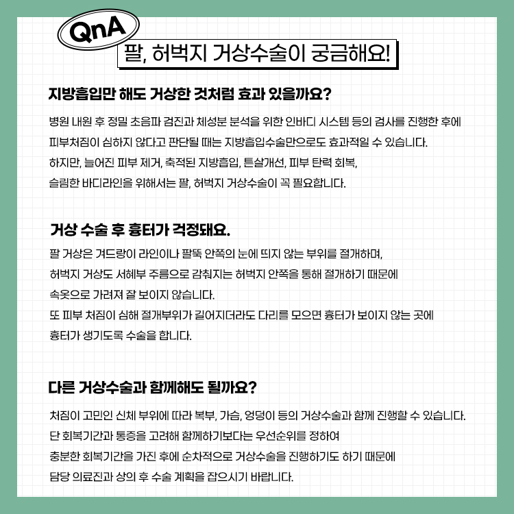 A3. 처짐이 고민인 신체 부위에 따라 복부, 가슴, 엉덩이 등의 거상수술과 함께 진행할 수 있습니다.