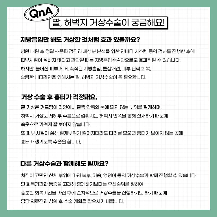 “지방흡입만으로 부족할 수 있습니다. 처진 살이 고민이라면 거상술을 고려하세요.”