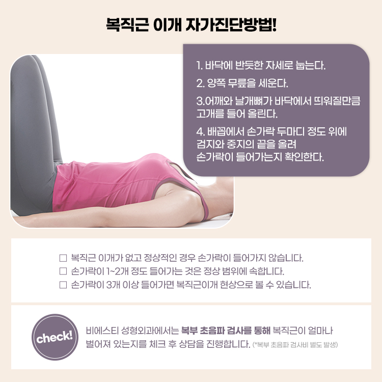 -> 손가락이 3개 이상 들어가면 복직근이개 현상으로 볼 수 있습니다.