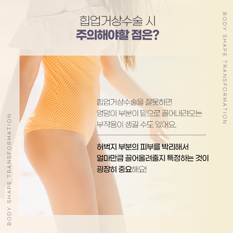 힙업거상수술을 잘못하면 엉덩이 부분이 밑으로 끌어내려오는 부작용이 생길 수도 있습니다.