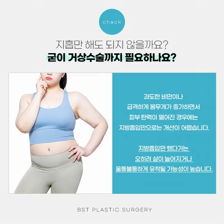지방이 제거되면 그 자리에 피부가 남게 되는데, 이 피부가 자연스럽게 수축되지 않으면 잉여 피부가 주름처럼 겹쳐져 보기 좋지 않은 외관을 초래할 수 있어요.