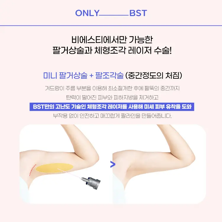 처진 피부를 해결할 뿐 아니라 지방까지 제거하기 떄문에 날씬하고 매끄러운 팔라인을 보실 수 있어요.