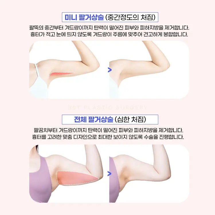 팔거상은 팔의 지방을 제거하고 처질 것으로 예상되는 피부, 이미 처진 피부를 제거하여 매끄러운 팔뚝라인이 가능해요.