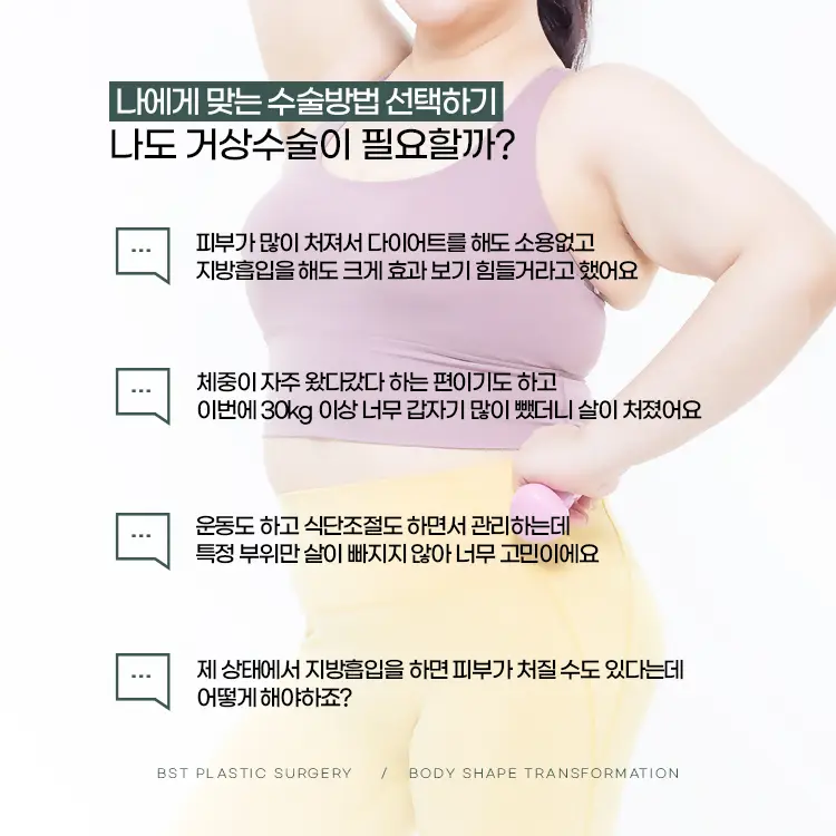 "지방을 빼는 수술"이 아닌, "남은 피부와 늘어진 조직을 정리하는 수술"이라고 보시면 더 정확합니다.
