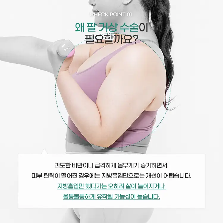 대상: 팔 안쪽 전체가 늘어진 경우, 체중 감량 후 팔 라인이 남은 경우