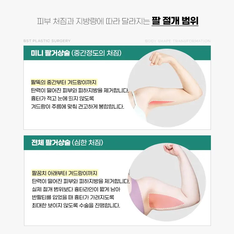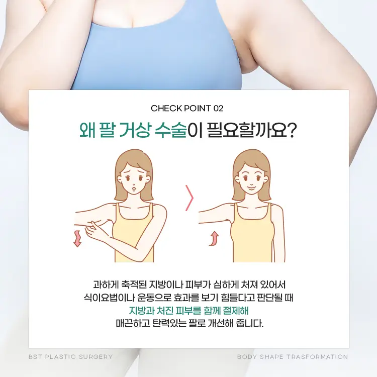 팔지방흡입 부작용으로 피부 처짐이 발생한 경우라면 팔거상수술이 가장 효과적이에요.