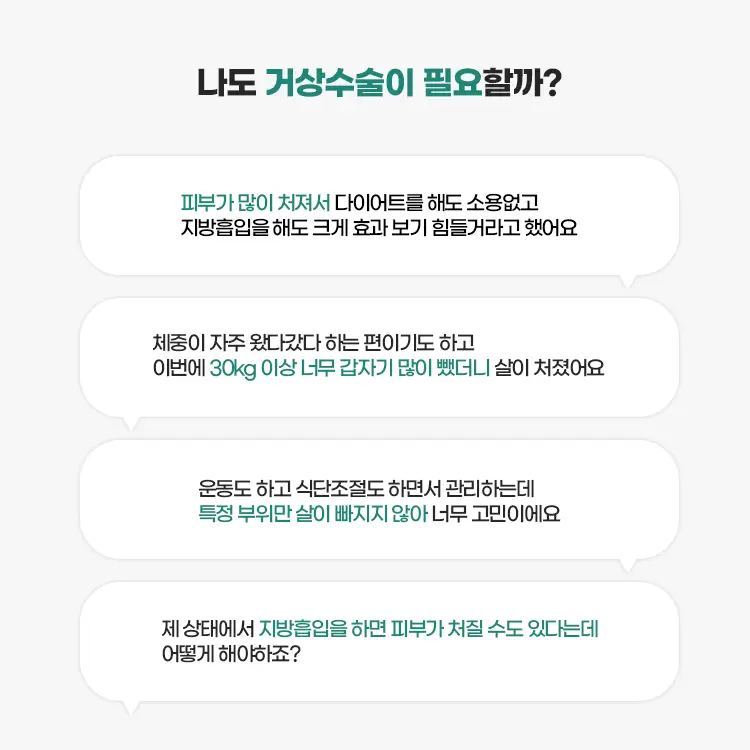 지방이 제거된 후 피부가 수축하지 않으면 오히려 처짐이 더 심해질 수 있어요.