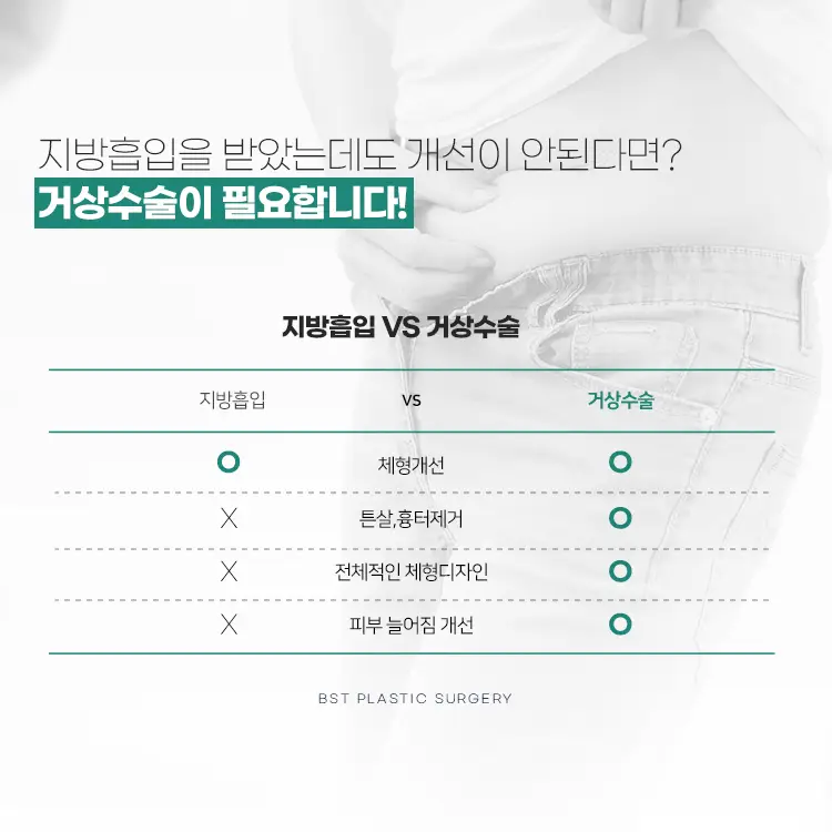 지방흡입은 지방을 제거할 수 있지만, 처진 피부 자체를 교정하지는 못해요.
