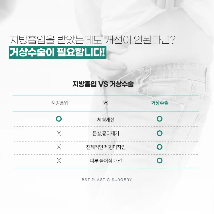 | 지방흡입 후 처짐 심화 | 탄력 저하로 피부가 더 늘어져 보임 |