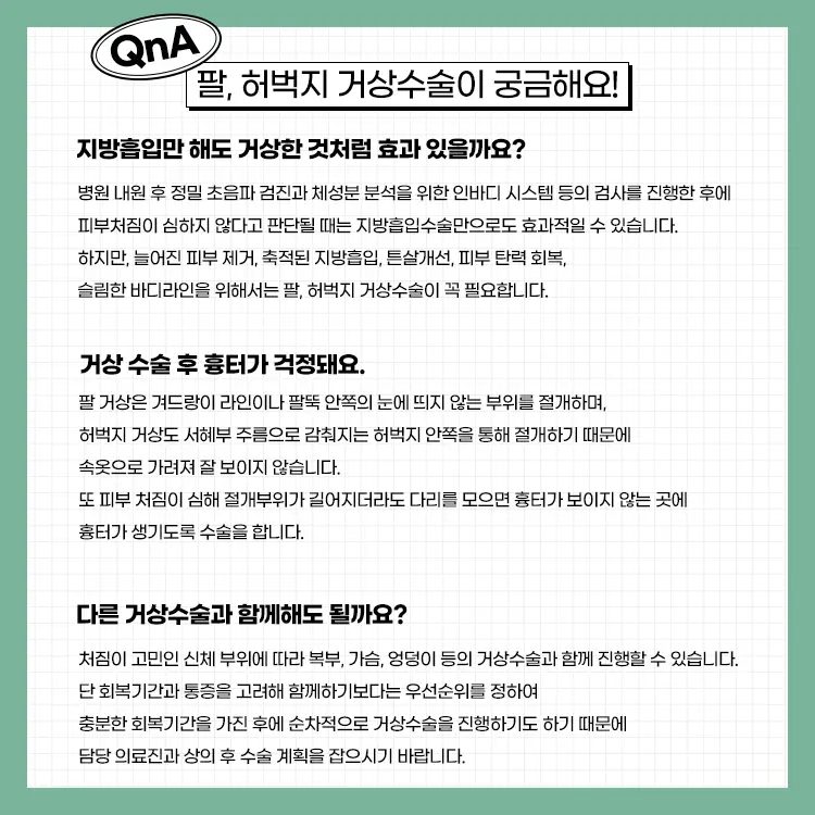 따라서 급격한 체중 변화, 노화 등 다양한 원인들로 인해 생긴 허벅지 주름은 피부 시술이 아닌 수술적 방법이 필요할 수 있어요.