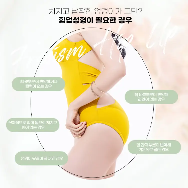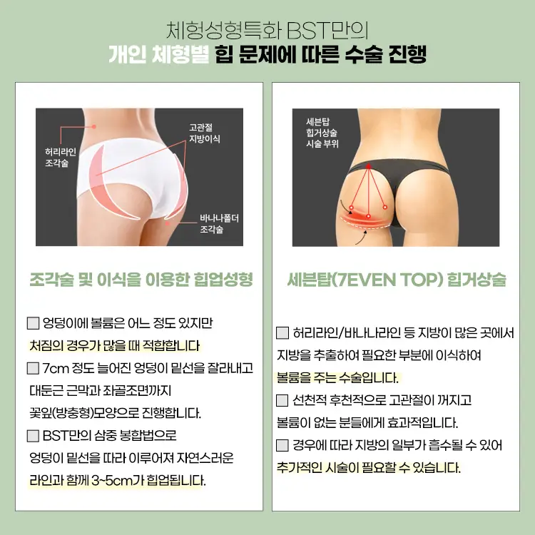 - 처짐과 탄력 저하가 함께 있나요? → 경우에 따라 힙거상술이나 다른 리프팅 수술이 필요합니다.